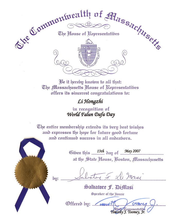 美国马萨诸塞州众议员杜美褒奖李洪志先生2007-5-13