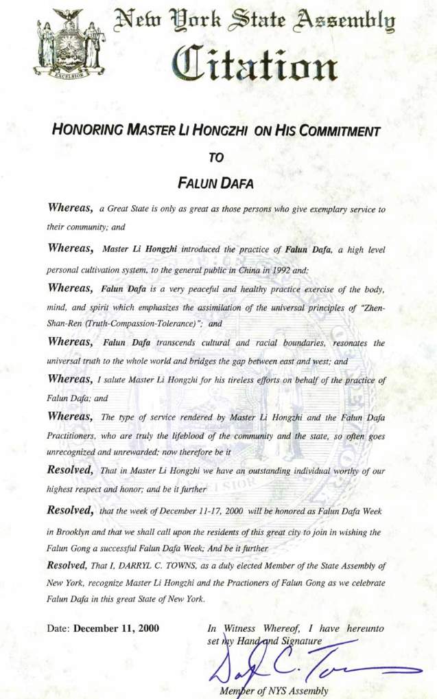 纽约州众议员褒奖李洪志老师和法轮大法及宣布2000年12月11-17日为布碌伦的法轮大法周 美国 纽约 2000-12