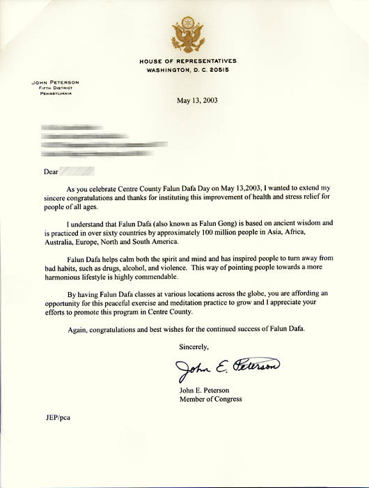 美国宾西法尼亚州国会议员褒奖法轮功 美国 宾州 2003-5