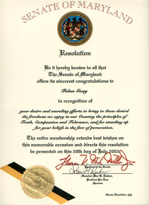 马里兰州参议院通过的褒奖法轮功决议 美国 马里兰州 2003-7