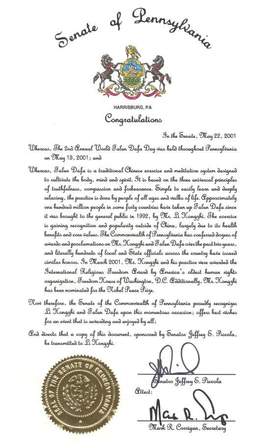 宾夕法尼亚州参议院嘉奖李洪志老师并祝贺“世界法轮大法日” 美国 宾夕法尼亚州 2001-5-22