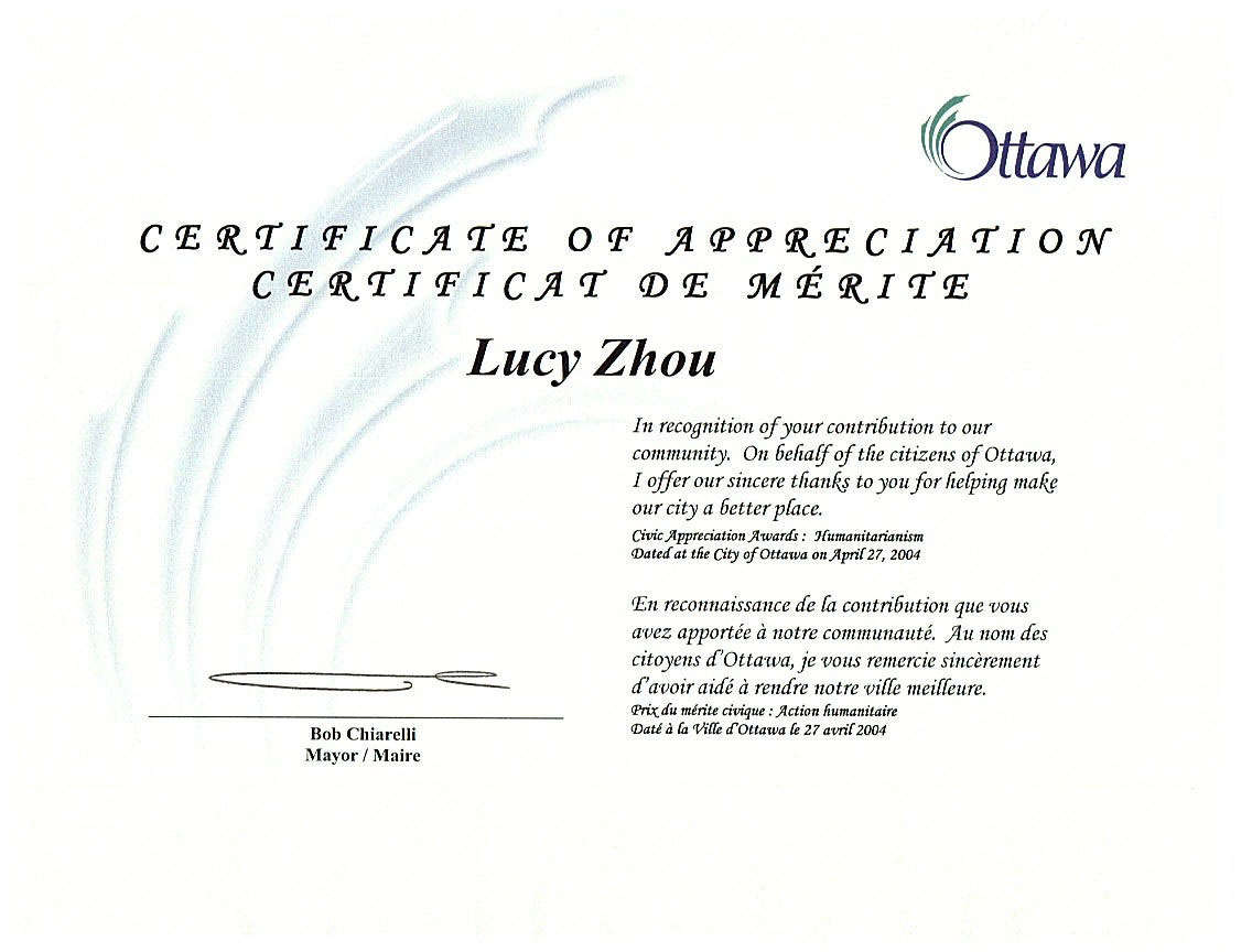 法轮功学员周露西获渥太华市政府“人道主义精神”类别公民表彰奖 图为渥太华市长签署颁发的奖状 加拿大 2004-4027