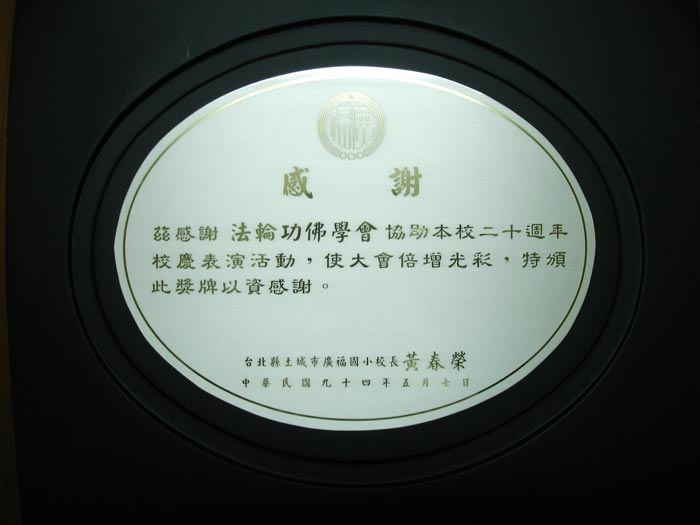 台湾广福国小校长特别颁发感谢状 感谢法轮功学员协助广福国小20周年校庆表演活动