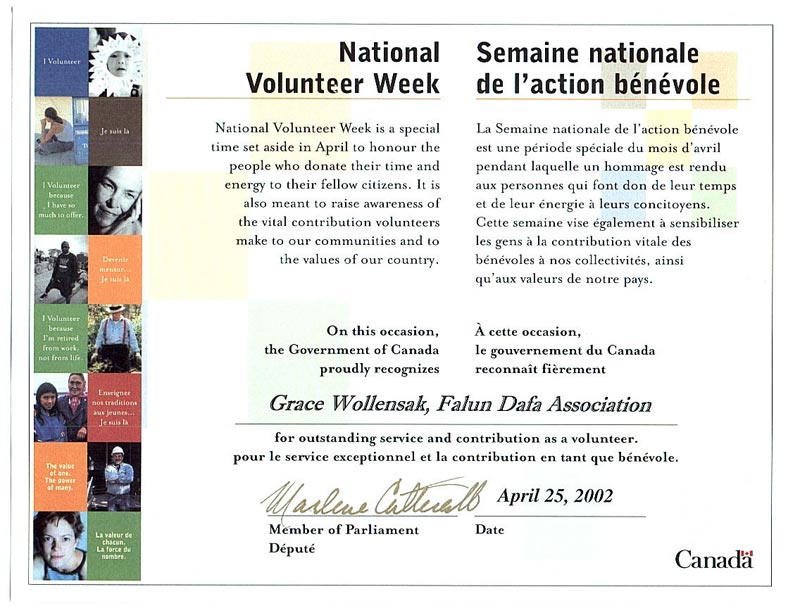 渥太华法轮功学员戴工羽在加拿大“国家义工周”向社区义务奉献的工作者颁奖仪式上获奖加拿大 2002-4-25