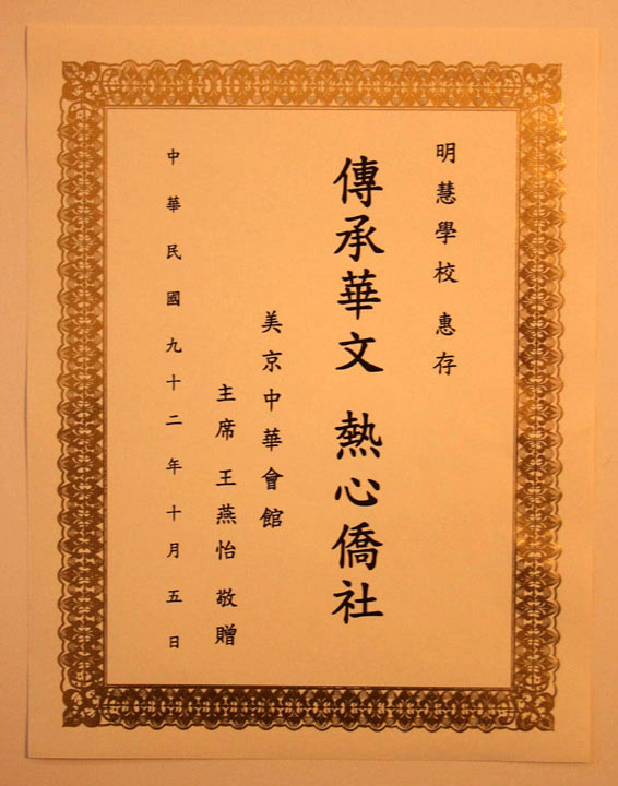 华府明慧学校参加中国城庆“双十”活动美京中华会馆为明慧学校热心侨社工作给予了奖状鼓励 美国 华盛顿 2003-10-10