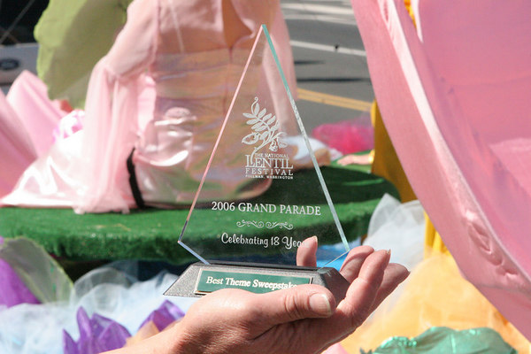 美国华盛顿州法轮功学员参加蒲门市滨豆节游行 连续第三年获奖 图为获得了此次游行的“最佳主题奖”奖杯2006-8-19