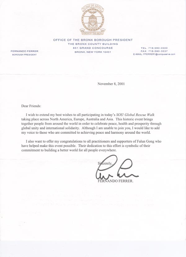 纽约市布朗克士区褒奖全球SOS紧急救援在中国被迫害的法轮功学员的步行者的褒奖状 美国 纽约市 2001-11-8