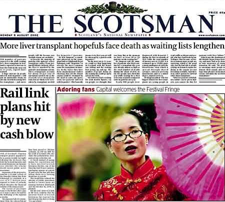 爱丁堡国际艺术节组委会向法轮大法表演队伍颁发了2002年「女王金禧庆典大游行」一等大奖 各家媒体纷纷报导 英国 爱丁堡 2002-8-4